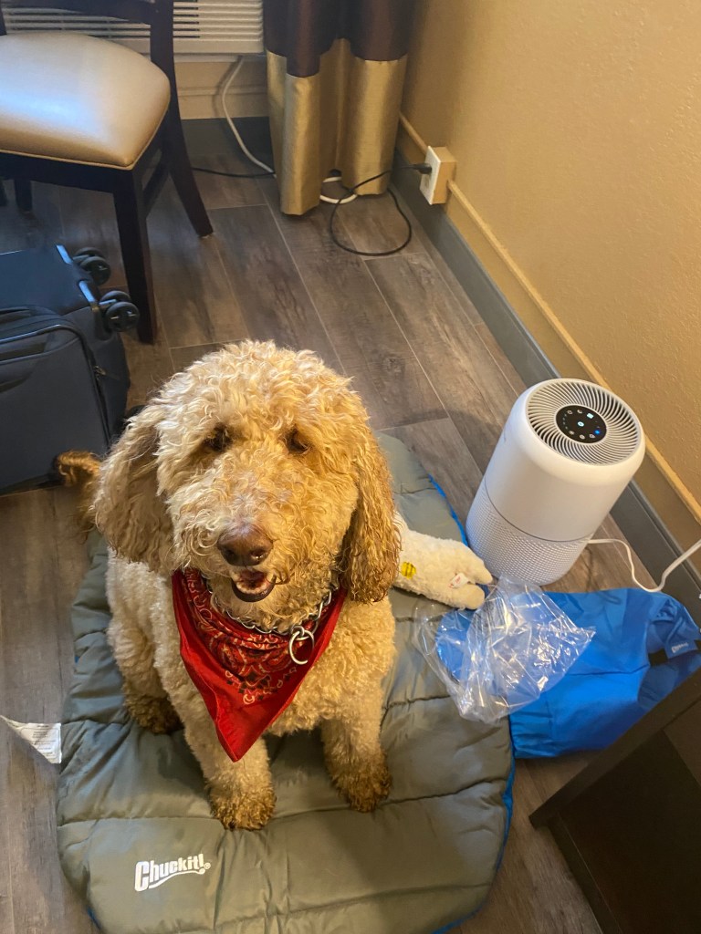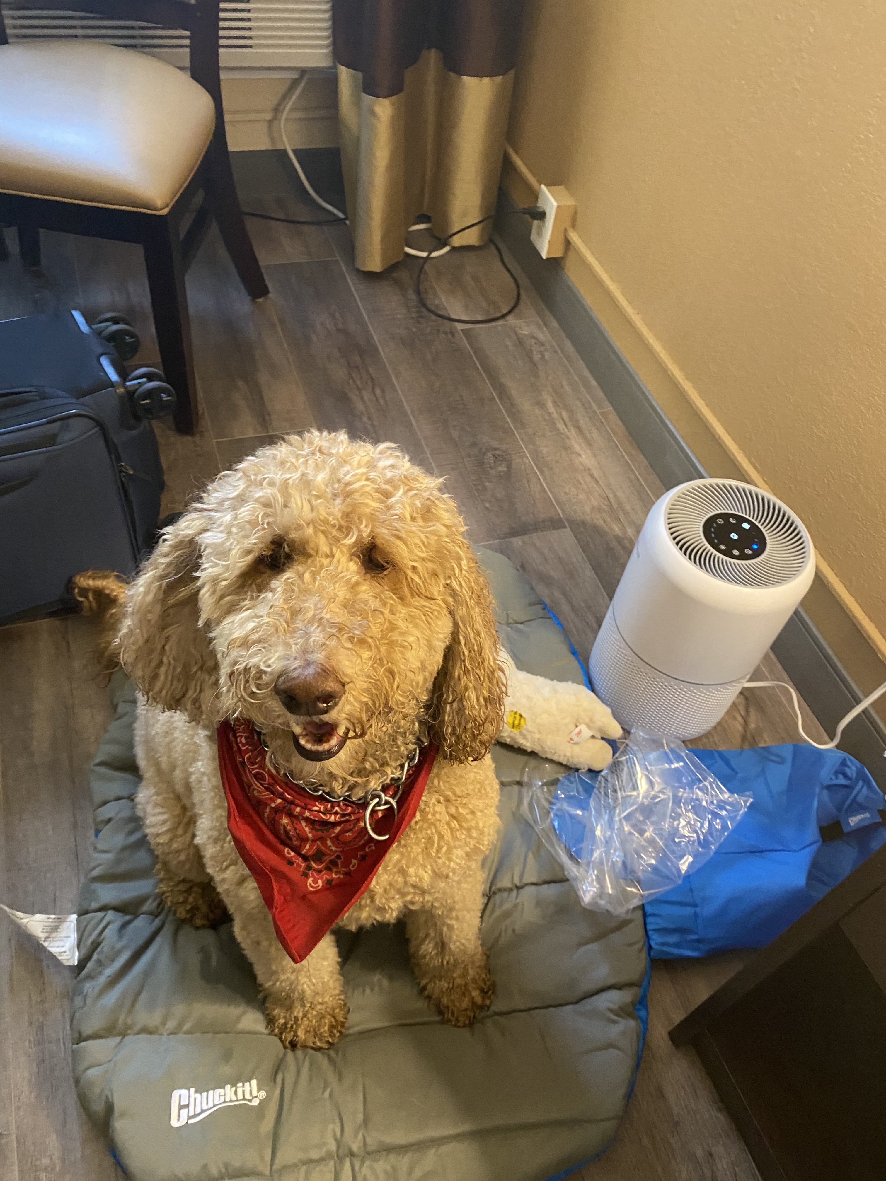 A group decision was made, due to the inclement weather we would cease walking about and head to the hotel. Best Westerns are not Mandarin Orientals but this one allowed puppies so it was just fine for us. It turns out their dog rooms are tiled not carpeted which makes hauling things in from the car with wet feet qualify for hazardous duty pay. And there was a lot to bring inside. In addition to Elaine’s and my rollaboard suitcases, Rosie had a bag full of treats and food. Additionally, she had a travel bed courtesy of my sister and a few other accoutrements to make sure she a mint on her pillow experience. This was after all her first hotel room. Additionally, also coutesey of my sister we had a Levolt portable air filtration system designed to keep us safe from ultra violet light pathogens that were likely lurking everywhere in our room.