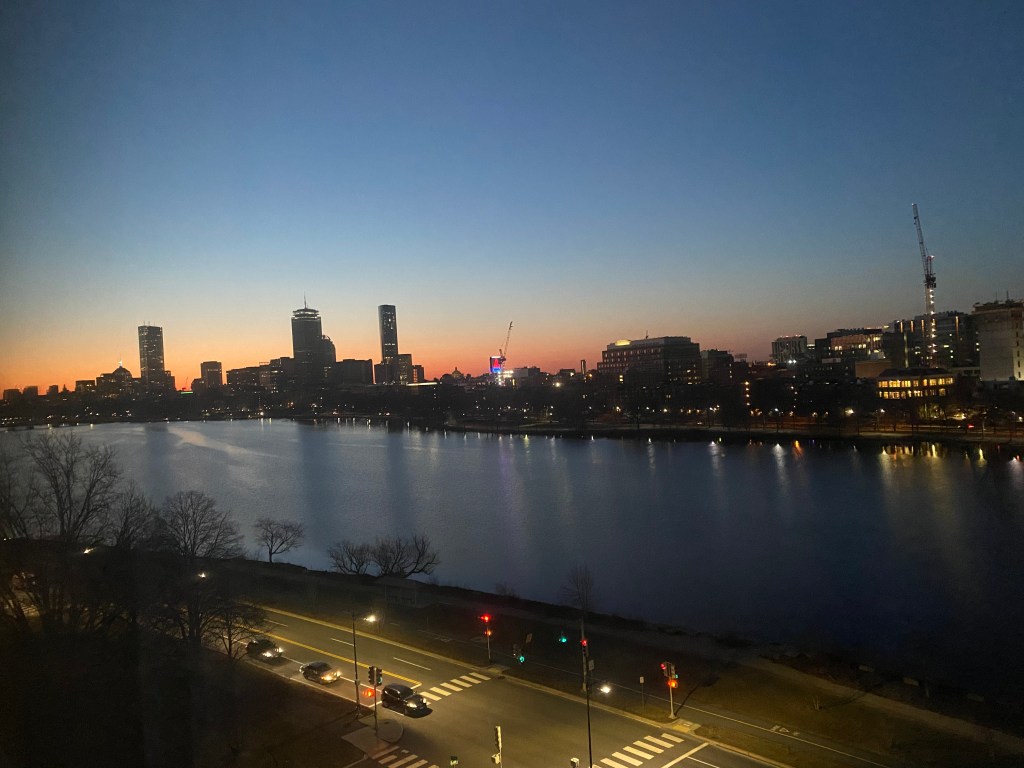 The hotel we decided to stay at is Grand Hyatt Cambridge. It offered dirt cheap rates, about $100 a night and had the bonus of being the first hotel I ever stayed it in Boston nearly 35 years ago. It also has a killah view of the Charles, The Fenway and downtown Boston. And for Rosie a wonderful walking path along the river. We were a little nervous about checking into such a large hotel but the place is almost empty and everyone follows protocols up to including individual elevator rides. That and the fact that everyone made a fuss over Rosie. As she would tell you herself, she is extremely petable.