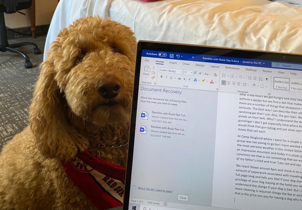 However before we got on the road we needed to get to the car. One of the unexpected parts of this journey is the amount of stuff we need to tote along when traveling with a dog in the time of Covid. Rosie had her own suitcase full of toys, treats, a bed (she likes but uses only for naps) bowls, and food. I don’t resent this in any way although I do wish I had taught her to carry her own bag before we left. Our Covid supplies include several bags containing food stuff, an entire bag containing PPE and sanitizing products and perhaps a bottle of Basil Hayden that I considered medicine after a long days drive. Add all this to Elaine’s and my modest suitcases full of casual wear and it is a production going to and from hotel rooms. Thankfully, we have had a very helpful and friendly porter named Paul who is also traveling with us.