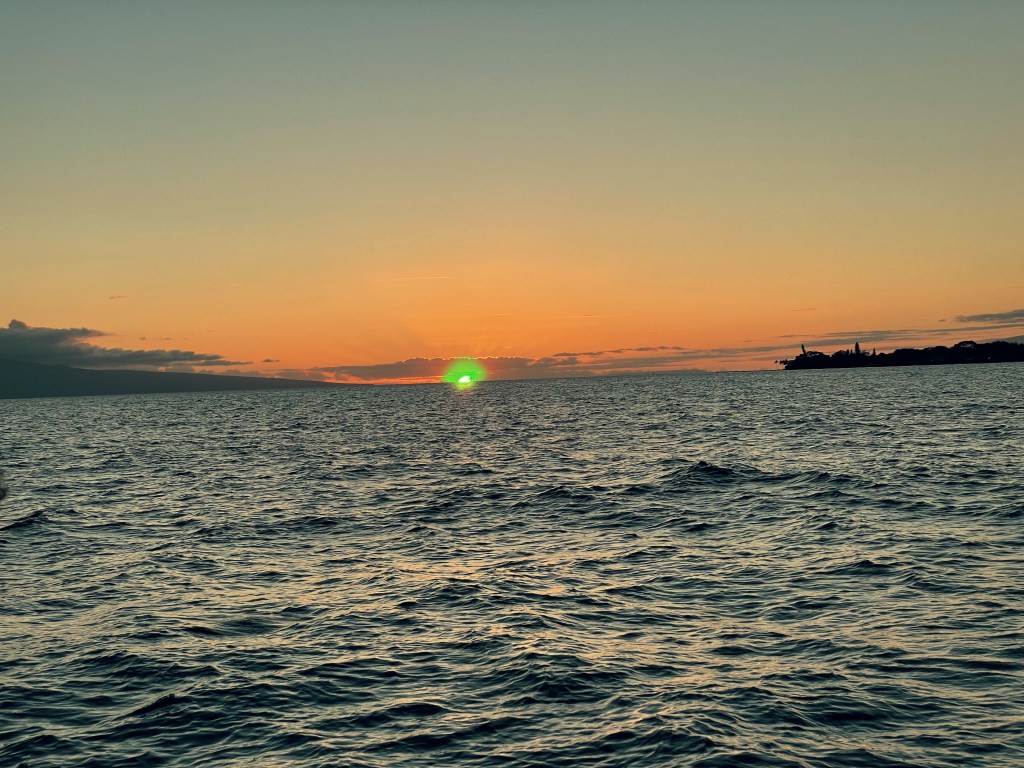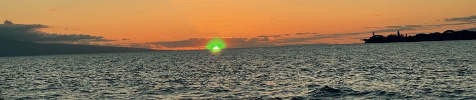 I feel the boat’s engines burble off. The boat is adrift, but Captain Kam has, with the skill of a sea goddess, positioned the boat so its stern is facing west. We are adrift. Waiting for the sun’s daily swan song. From where I sit, I can see on my right the black silhouette of the hills of the Kapalua peninsula jutting out into the inky blue of the Pacific. To my left, the northern tip of Lanai and perfectly centered between the two, in a robin’s egg blue sky is the golden sun. The rest of my party has not joined me in the stern. I don’t know why. Maybe they are not interested in postcard perfect sunsets or seeing green flashes. Or maybe they just don’t know that the day is about to give way to the night. Captain Kam and Mo are also strangely absent. Perhaps they have seen too many sunsets for this one to matter or far more likely, knowing the captain, she feels her presence would be an intrusion.
