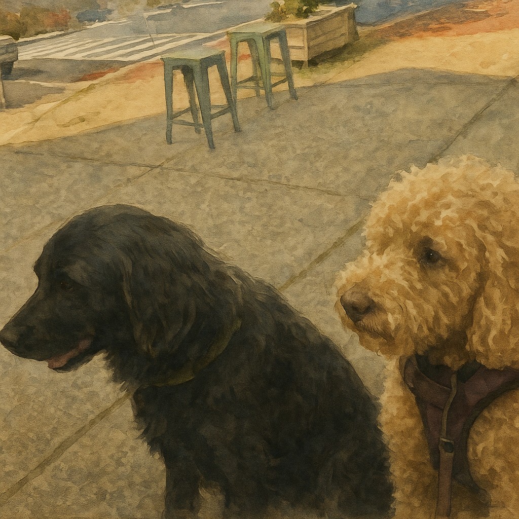 We weren’t alone. Our furry companions joined: Rosie, my ten-year-old labradoodle (basically a Gund plush toy come to life), and Norman, my sister’s very handsome eleven-month-old pup. (And yes, with her married name being Bates, the Norman reference is not lost on anyone—cue ominous violins.) Their cuteness guaranteed constant interruptions from passersby eager to gush, coo, or witness a canine bark-fest when another dog dared to invade their orbit.