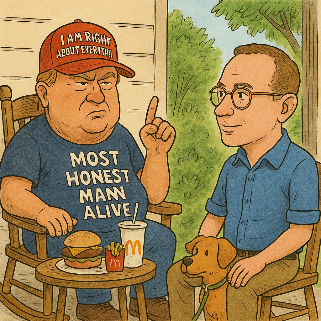 I found him sitting on the porch of his “home.” He was wearing a bright red hat that read in capital white letters: I AM RIGHT ABOUT EVERYTHING, and a t-shirt stretched to its structural limits: Most Honest Man Alive. In front of him were the remains of his lunch—two Big Macs, two Filet-O-Fish sandwiches, and a Diet Coke.