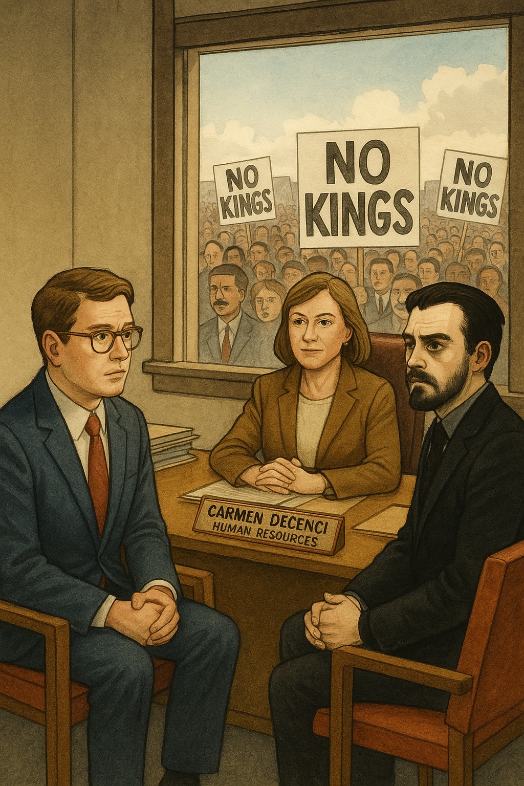 The door opens and a kindly looking woman in her mid-forties and wearing a neutral colored, well cut pant suit emerges. She beckons both them into her office. They make themselves comfortable in midcentury modern chairs whose burnt orange upholstery looks as if it has been visited by a few too many backsides in recent months. She sits behind her desk, which solid build would look at home in any mid-level bureaucrat’s office in Washington. Behind her is large window, which from her third floor office depicts Pennsylvania Avenue with hundreds of thousands of demonstrators holding placards and banners that even from this distance you can see say “No Kings.”