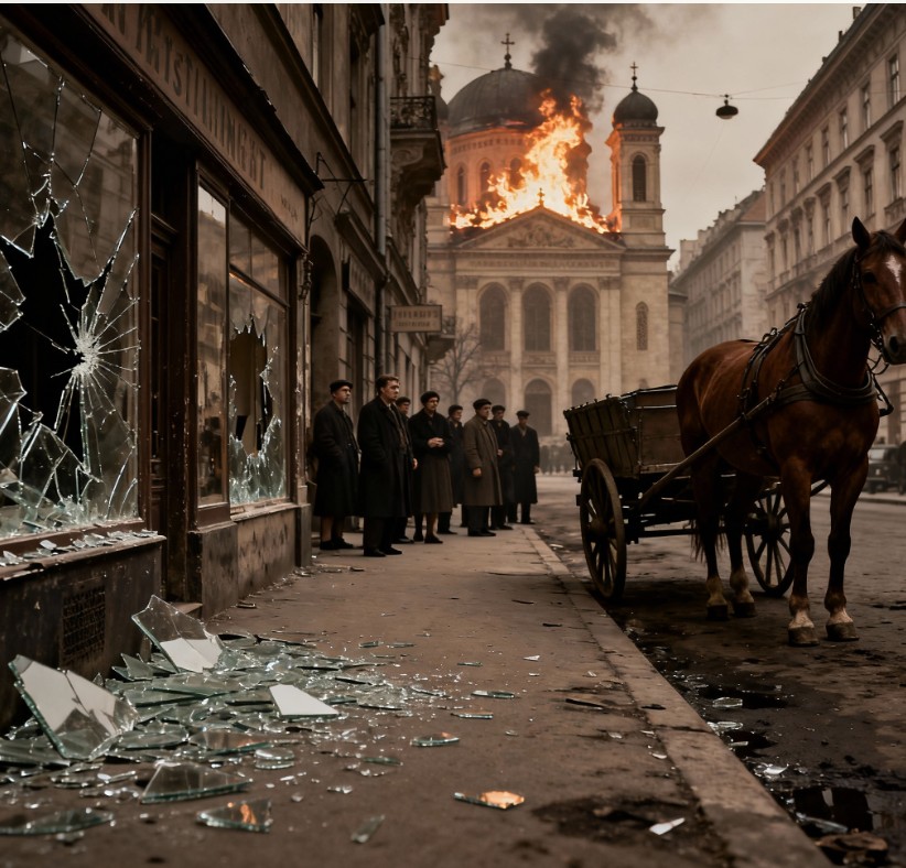 Groups of people were standing in front of the broken windows of Jewish stores, gawking while Brownshirts were putting their owners through their paces — handing over business papers, washing the sidewalk with lye, licking Aryan employees shoes clean. Anything that would keep the cultured Viennese crowds amused. We passed a narrow street that led to one of Vienna’s larger synagogue. The alley was jammed with jeering onlookers. Stormtroopers were throwing furniture and Torah scrolls through the big main door into the street. One side of the roof (I couldnt see the other and you know what a sceptic I am ) was afire. I remember very vividly the twists of whitish-yellow smoke that were curling up the slope of blue tiles.